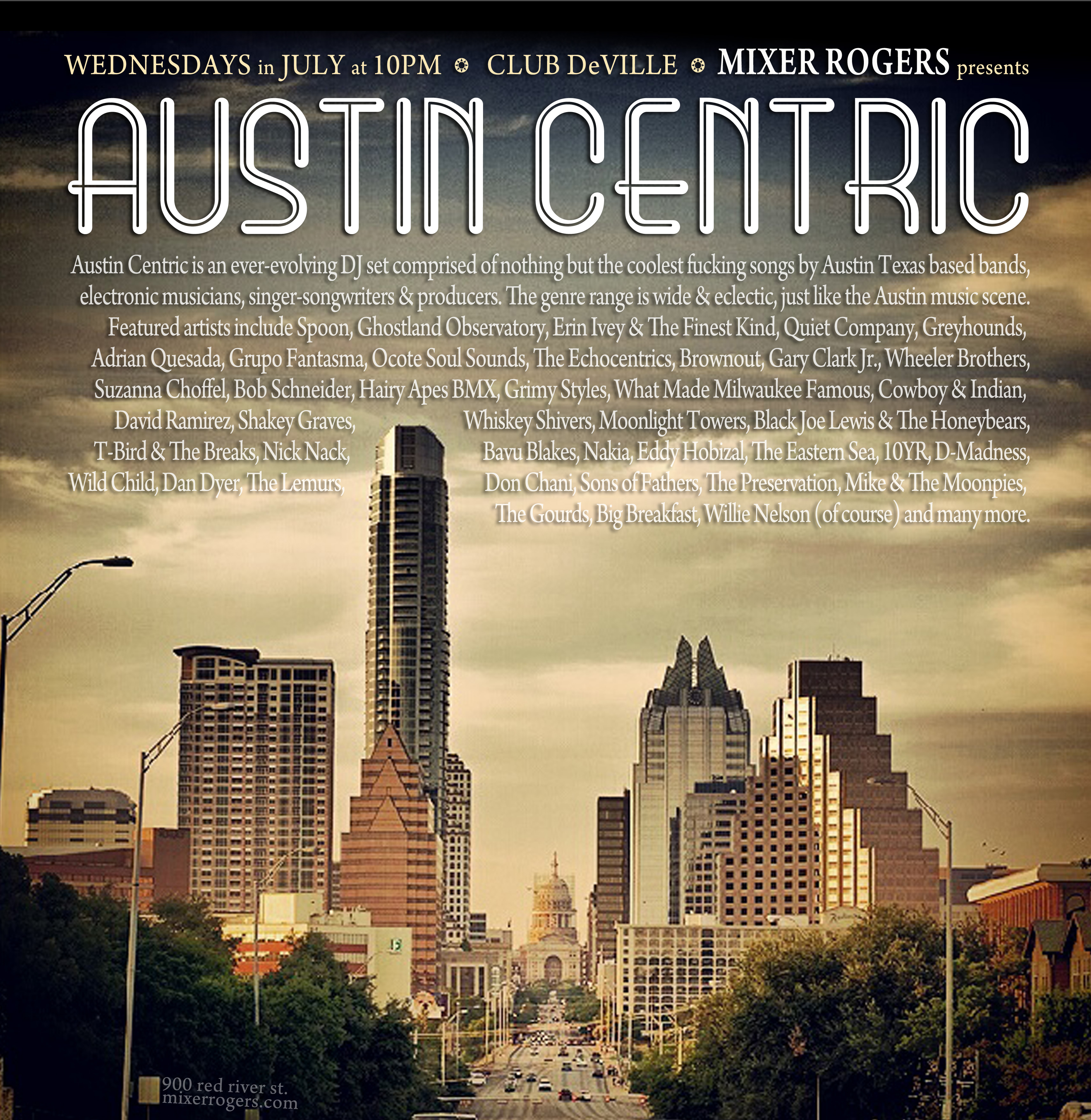 EVERY WEDNESDAY in July (the 11th, 18th & 25th) at Club DeVille, I present {AUSTIN CENTRIC} Only the coolest fucking songs from Austin based bands, electronic musicians, singer-songwriters and producers. I’ve been working on this concept for a while and I am excited to get this thing going. Music starts at 10pm. Come say hi.