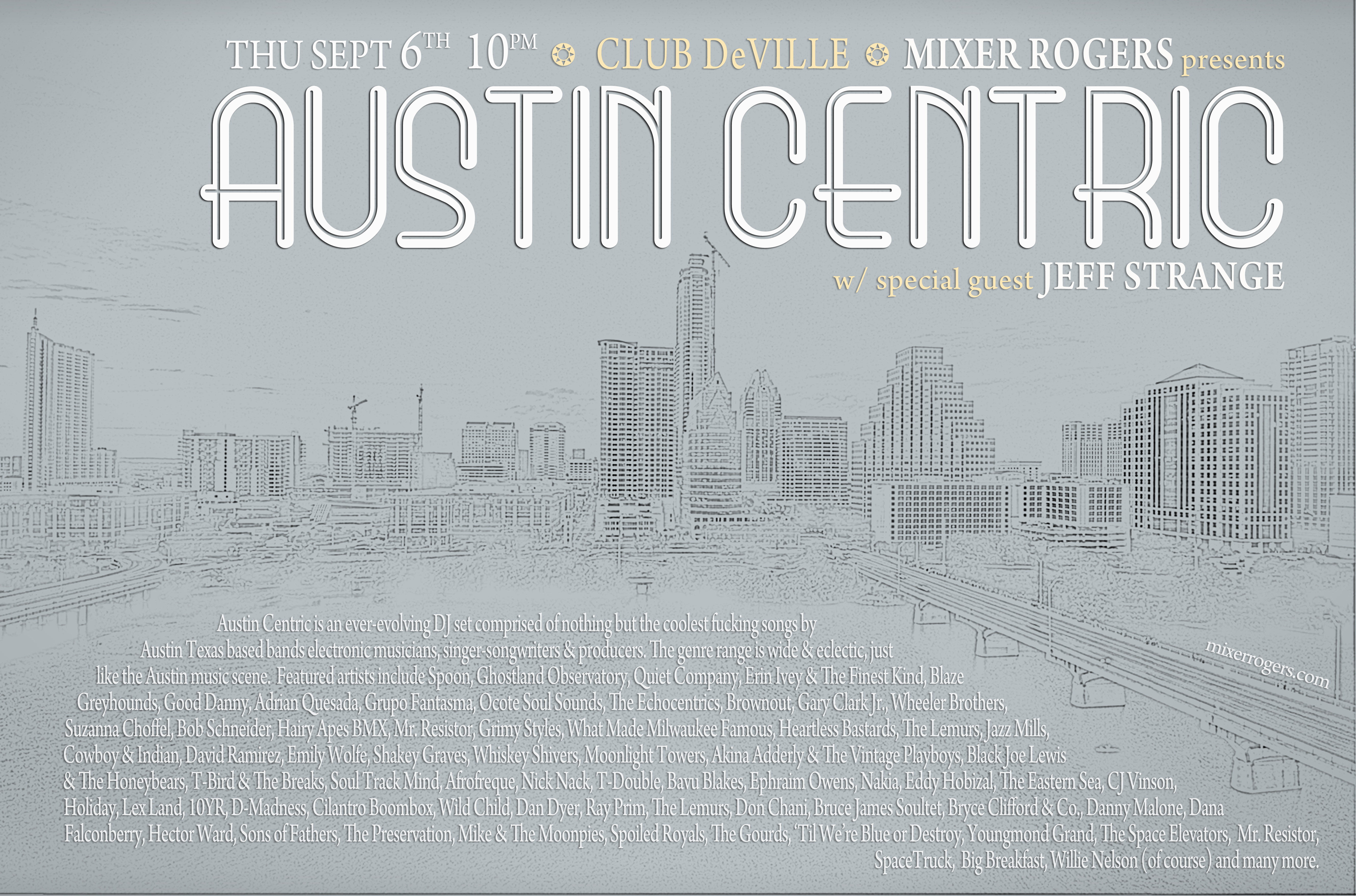 The next AUSTIN CENTRIC is Thu Sept 6th at Club DeVille. I will be joined by my main man Jeff Strange on the turntables. And of course you get the one Will Rhodes running sound. The show kicks off at 10pm and we will rock it until 2am. Come on out and hear all your favorite Austin Texas music all mushed together in the funkiest possible way. NO COVER!