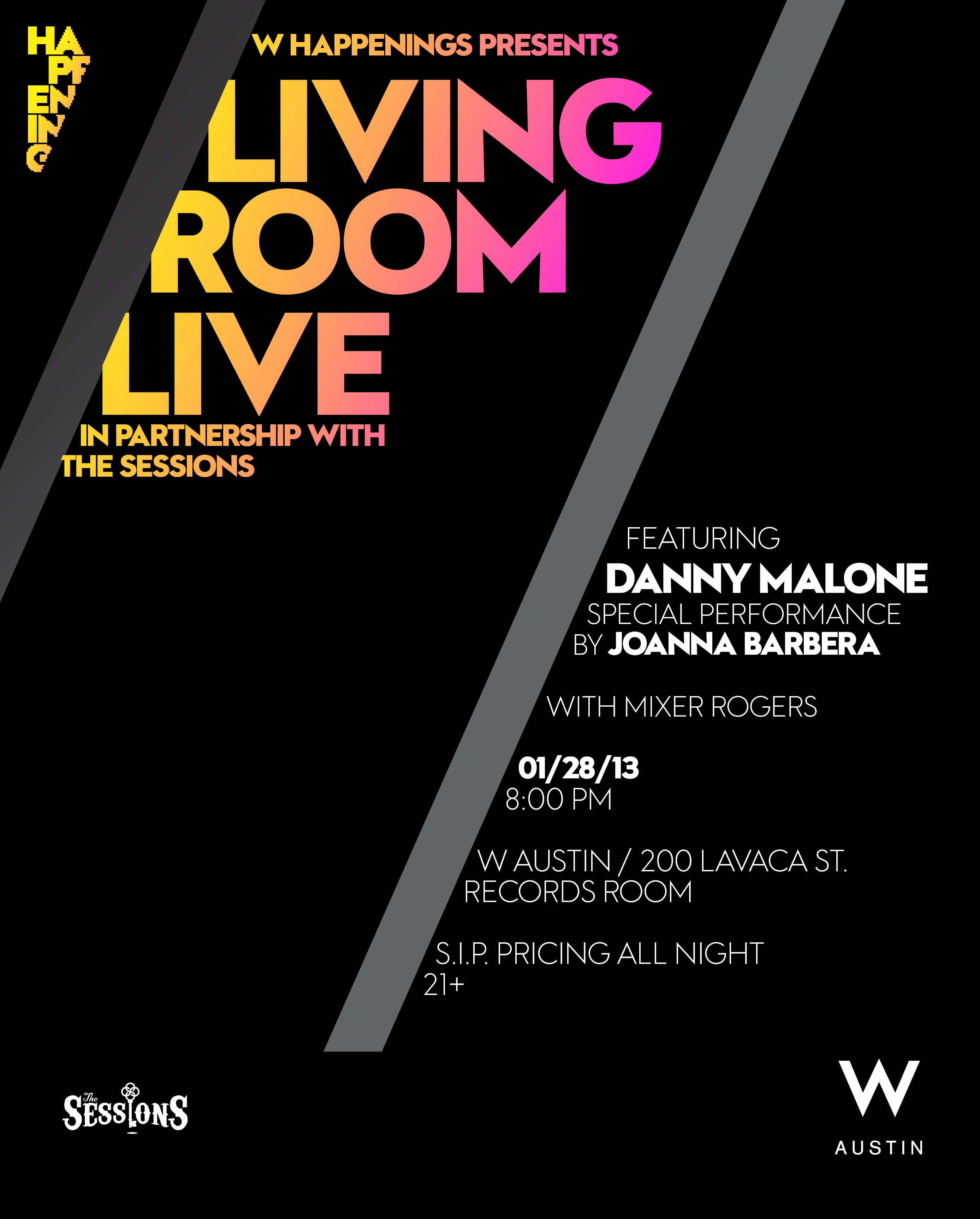 The next Living Room Live installment will be Monday January 28th from 8p-12a at The W Hotel in Austin TX. It is produced by The Sessions and features sets by Danny Malone and Joanna Barbera & Mixer Rogers. NO COVER. Hope to see you.