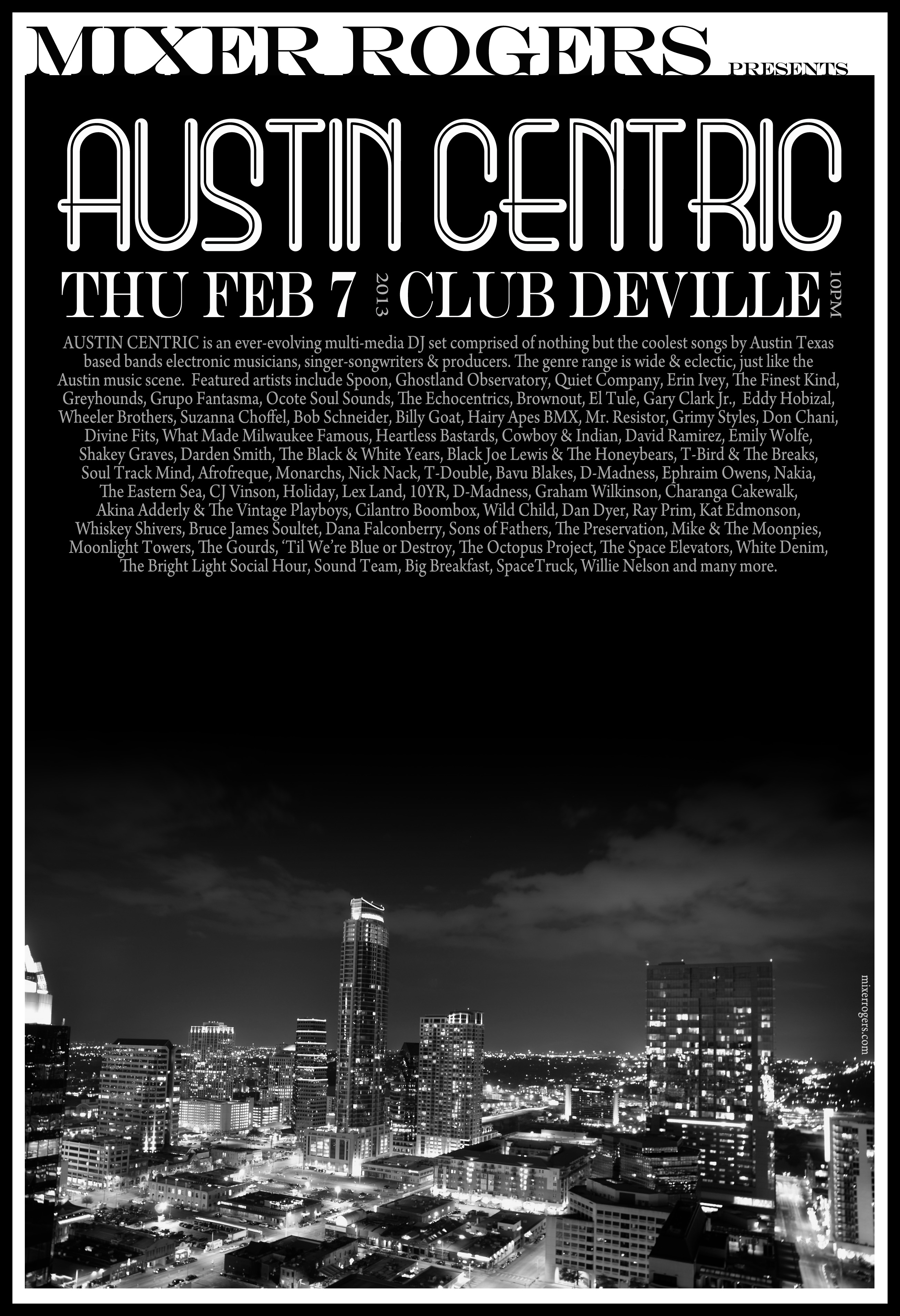 I will be performing my AUSTIN CENTRIC set at Club DeVille on Thursday February 7th from 10pm-2am. I will be employing a projector and a bad ass slideshow to accompany my all out Austin assault. This thing is cool. Come check it out.