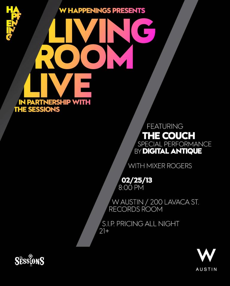 On Monday Feb 25th I will be joined by The Couch and Digital Antique at The W Hotel in Austin. In the Record Room. No cover. I’ll start stirring things up about 7:30pm. Come see me.