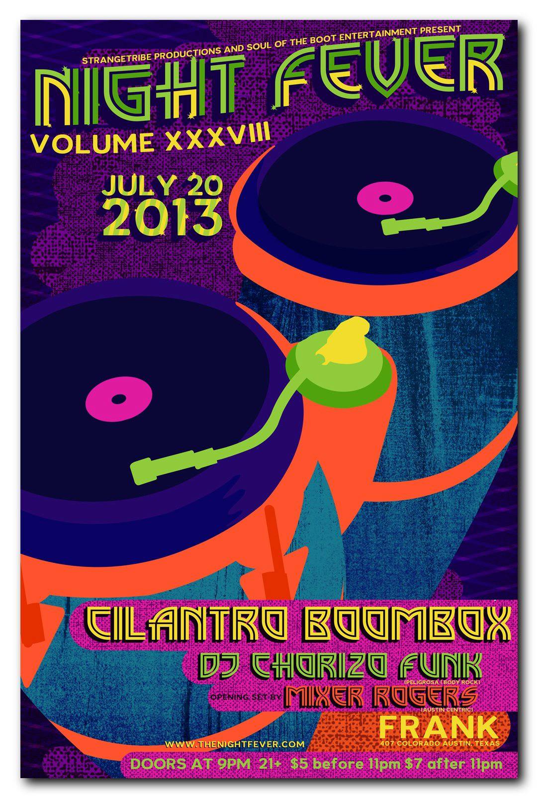 I’m super excited about this one. Night Fever! These are my boys! Jeff Strange (Stragetribe Productions), Papa Chop (Soul of the Boot Entertainment), Felix Pacheco and his band Cilantro Boombox and Eddie Campos aka Chorizo Funk. This is a killer lineup that I am really happy to be a part of.