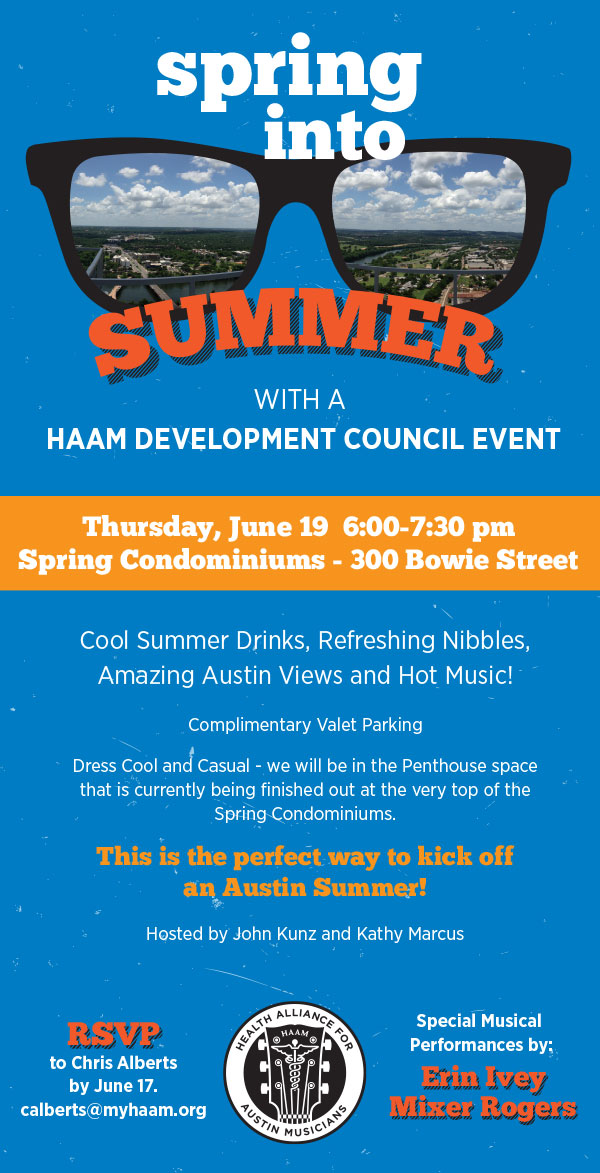 Being a proud HAAM member, I am honored to play their “Spring Into Summer” event for the HAAM Development Council. They will be raising money and partying hard, to the sounds of my Austin Centric mix and a very special and very dreamy performance by my favorite singer songwriter in the world, Mrs. Erin Rogers…I mean Ivey 😉 If you’d like to donate to a really good cause and party in the penthouse with us, RSVP to Chris Alberts by June 17 at calberts@myhaam.org. Hope to see you there.