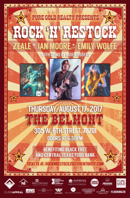 Thursday August 17th at the Belmont! It’s Rock’n’Restock. This will be my second time to DJ this great event. Big thanks to Pure Gold Realty for having me. I’ll kick the night off at 6:30pm and keep the vibe right in between Ian Moore, Emily Wolfe and Zeale. We’ll throw down until about midnight. It’s all for a good cause, benefitting Black Fret and Central Texas Food Bank. Get your tickets HERE. See you there.