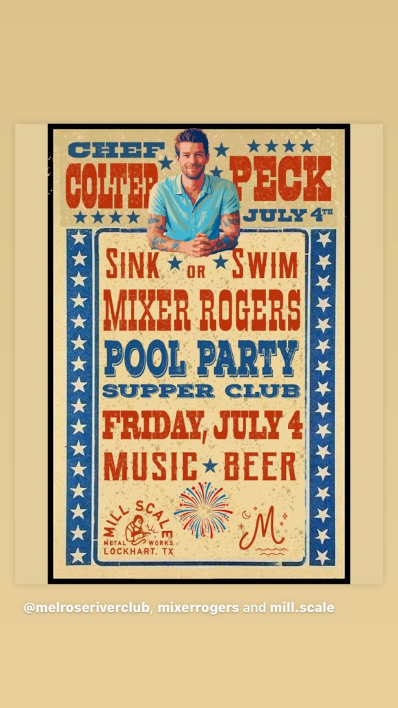 Join us poolside on the San Marcos River in San Marcos TX for an amazing 4th of July edition of the Melrose Supper Club. Your ticket gets you a 3 course meal by famed chef, Colter Peck, endless dips in the pool and great music by yours truly. 4-9pm. Better yet, book a room and stay all night. Tickets available HERE
